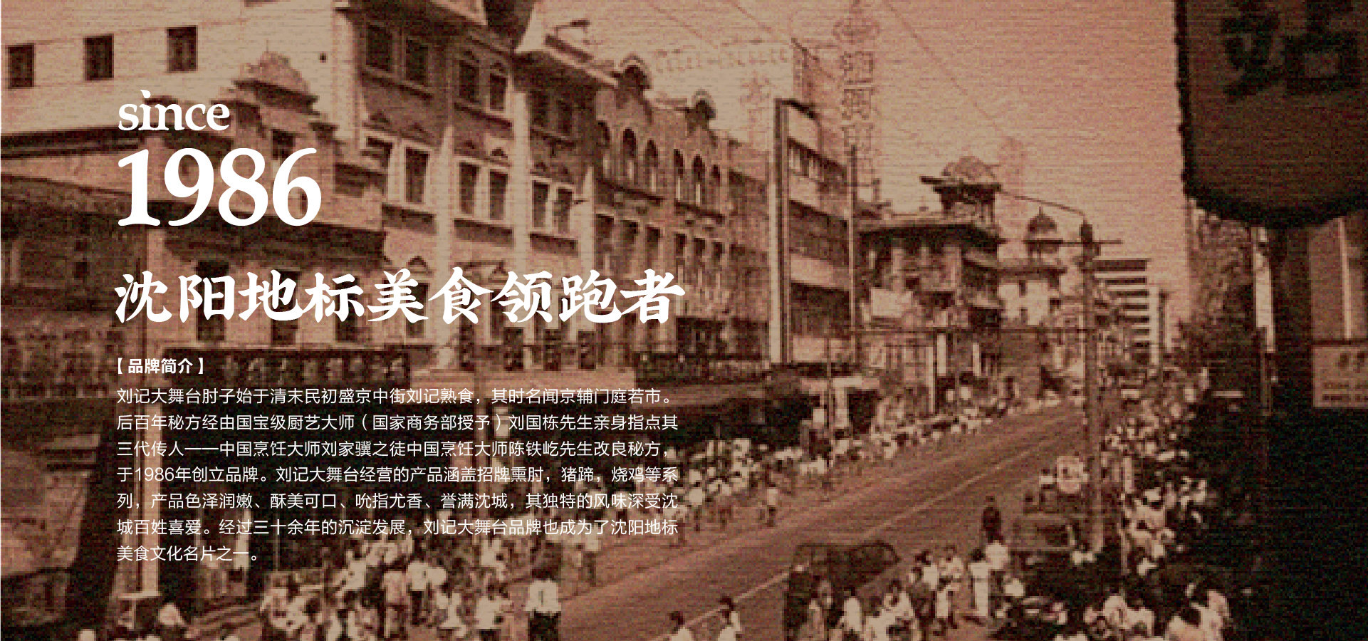盛京,昔乃大清王朝發(fā)祥之地。劉記大舞臺肘子始于清末民初盛京中街劉記熟食,其時名聞京輔門庭若市。后百年秘方經(jīng)由國寶級廚藝大師(國家商務部授予)劉國棟先生親身指點其三代傳人——中國烹飪大師劉家驥之徒中國烹飪大師陳鐵屹先生改良秘方,于1986年創(chuàng)立品牌。劉記大舞臺經(jīng)營的產品涵蓋招牌熏肘,豬蹄,燒雞等系列,產品色澤潤嫩、酥美可口、吮指尤香、譽滿沈城,遂成古今絕味,其獨特的風味深受沈城百姓喜愛。經(jīng)過三十余年的沉淀發(fā)展,劉記大舞臺品牌也成為了沈陽地標美食文化名片之一。